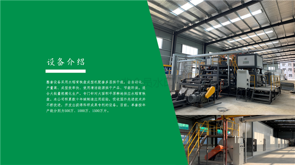整套設備采用水稻育秧盤成型機配套多層烘干線,全自動化、產量高、成型效率快、使用清潔能源烘干產品、節能環保。適合大批量規模化生產,專門針對大面積平原耕地供應水稻育秧盤。本公司積累數十年械制造應用經驗,吸收國外先進技術并不斷改進,目前,單臺按年產量分別為500萬及1000萬片。